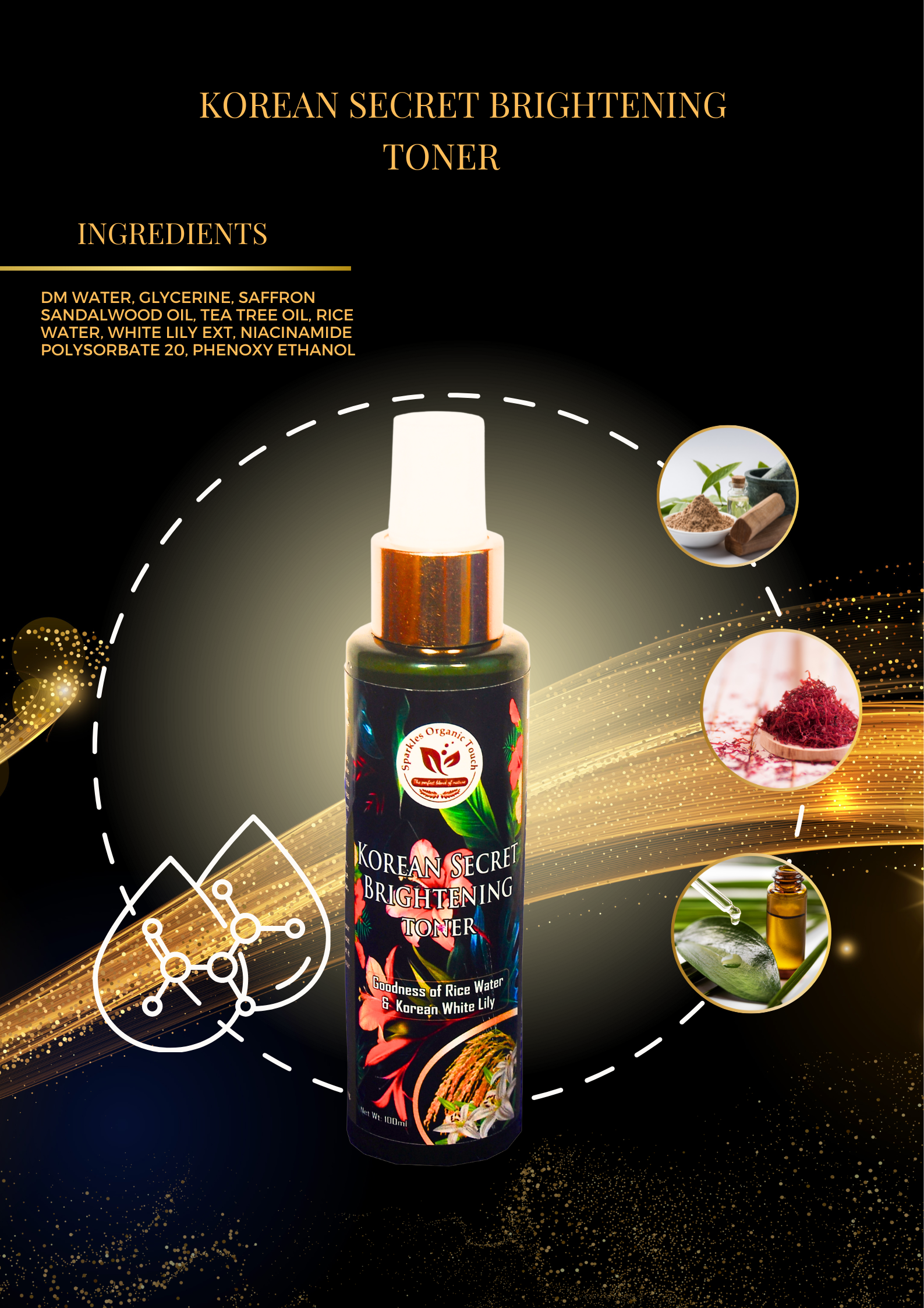 Refresh and brighten your skin with Sparkles Organic Touch Korean Secret Brightening Toner. Enriched with Niacinamide, Rice Water, and Korean White Lily, this toner deeply hydrates, refines pores, balances skin tone, and enhances your natural glow for healthy, radiant skin.