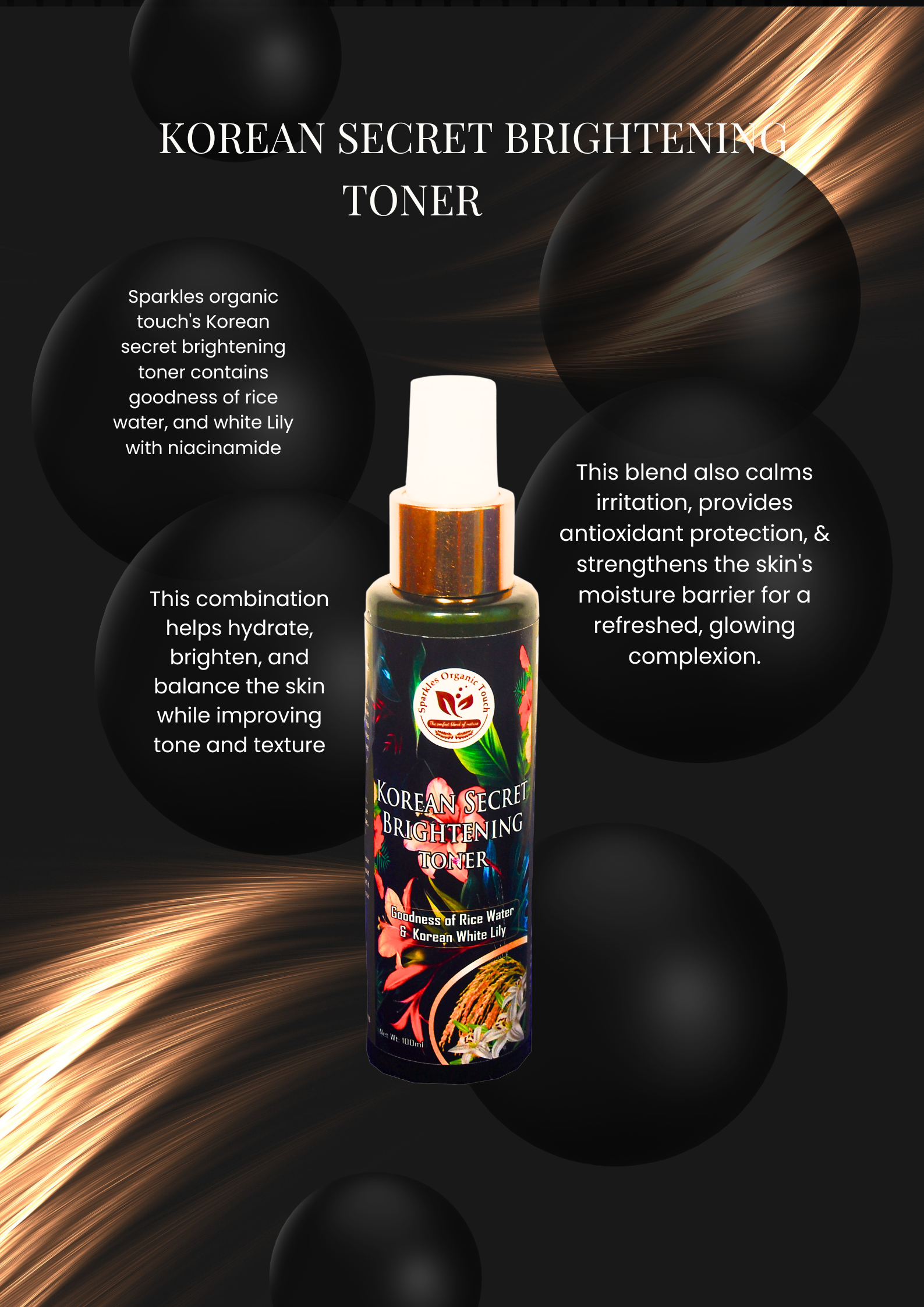 Perfect for daily use, Sparkles Organic Touch Korean Secret Brightening Toner helps restore the skin’s natural balance while delivering deep hydration and radiance for a clear and luminous complexion.